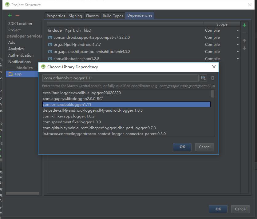 搜索关键字logger,找到com.orhanobut:logger :* -->OK